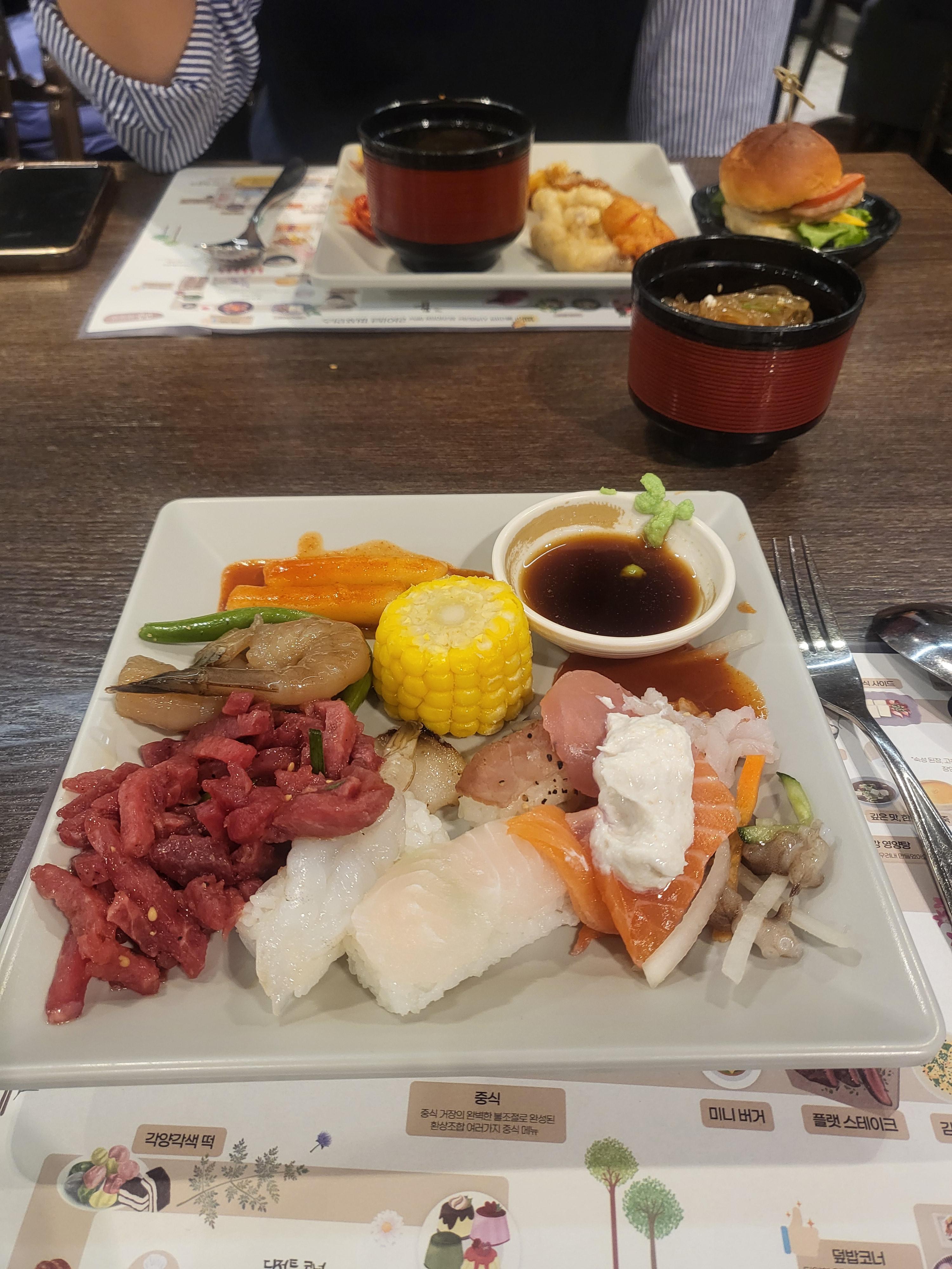 뷔페는 시간대별로 모든 홀이 다 같은 곳을 사용해서 <복잡>했지만 예식별로 구역이 나눠져 있다. 뷔페 동선이 매우 넓고, 음식은 다양하지만 파스타 오꼬노미야끼 등 직접 줄을서야 만들어 주는거라 오랜 기다림으로 인해 포기!!! 하지만,,, <튀김> 맛집이니 꼭 드시길 ~~~<새우장>과 <연어회>도 맛있었음! 사람이 정말 많아서 비어있는 음식들도 많았다 ㅠㅠ... 위치가 좋은데 홀도 예뻐서 찾는 사람들이 많은 예식장 인 것 같다👍👍💙
