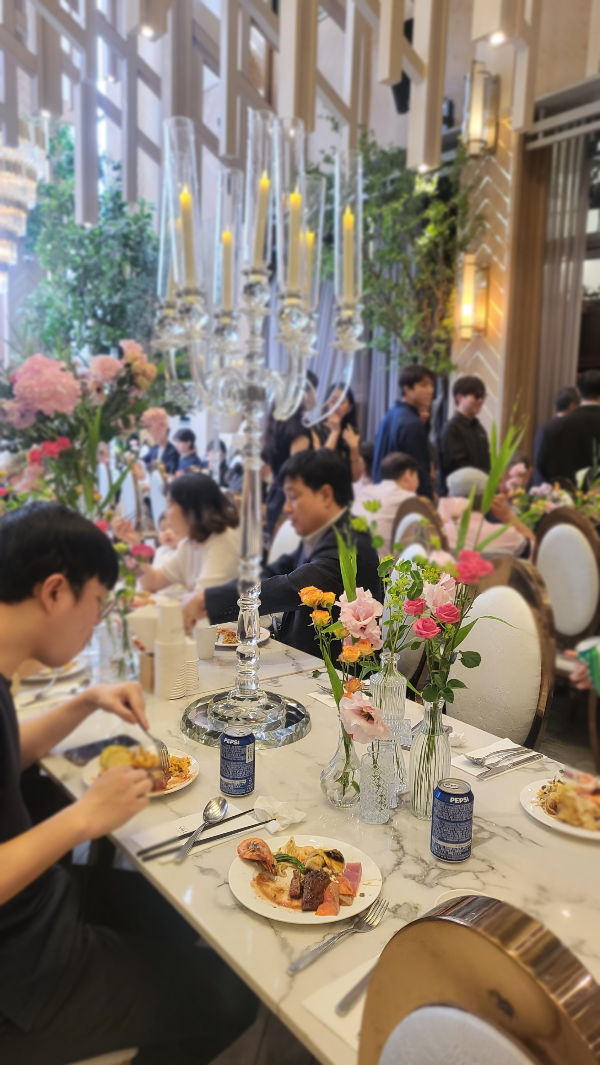 밥 먹는 연회장 또한 생화로 예쁘게 꾸며져 있고, 호텔에서 먹는 식사느낌?이라고 다들 이야기했어요. 어디 놀러 온 느낌이라 너무 좋았습니다.