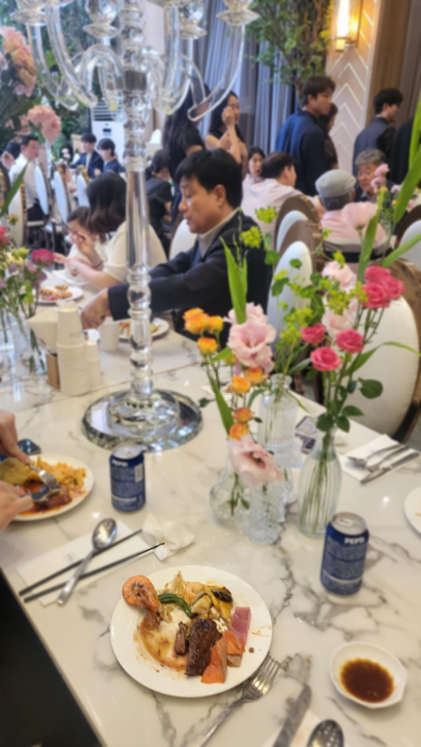 위에 사진은 남편 거 아래접시는 내 거... 남편은 뷔페 가면 볶음밥 꼭 먹어요🤣 보통 뷔페보다는 살짝 가짓수가 적지만 하나하나 다 맛있어서 대만족이었어요. 스테이크랑 연어회 백김치 육회 등... 맛있게 잘 먹었고, 다들 디저트도 너무 고급스럽고 맛있다며 야무지게 먹었습니다.