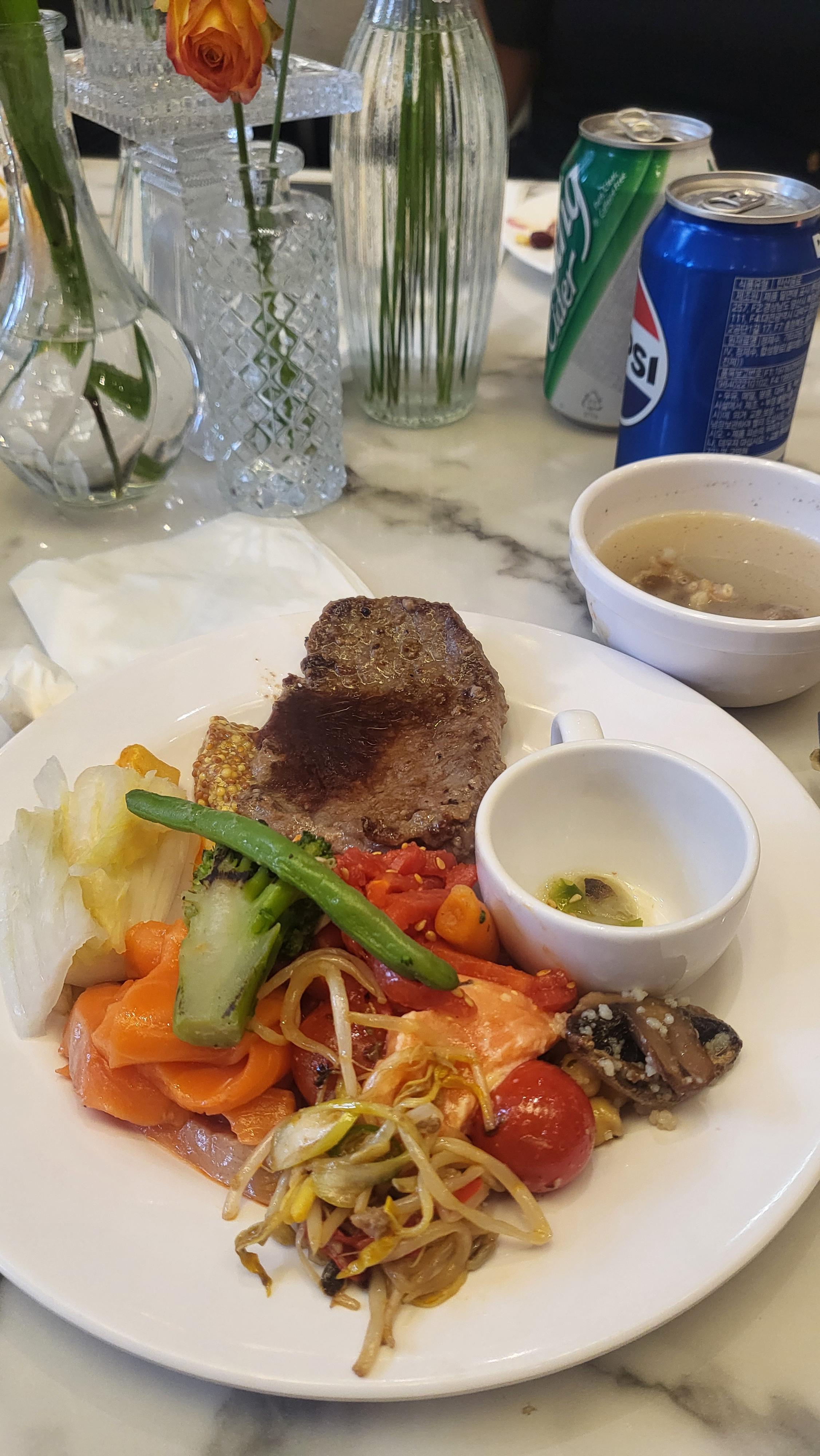 꽃게랑 대게다리 찜이 있었지만... 너무 먹기 불편해서 패스... 스테이크랑 같이 준 새우구이도 먹고 후회했어요... (너무 지저분해지는 내 자리...) 다이어트 중이라.. 초밥이나 파스타류는 패스했고,,, 고기와 해산물 위주로 먹었습니다.