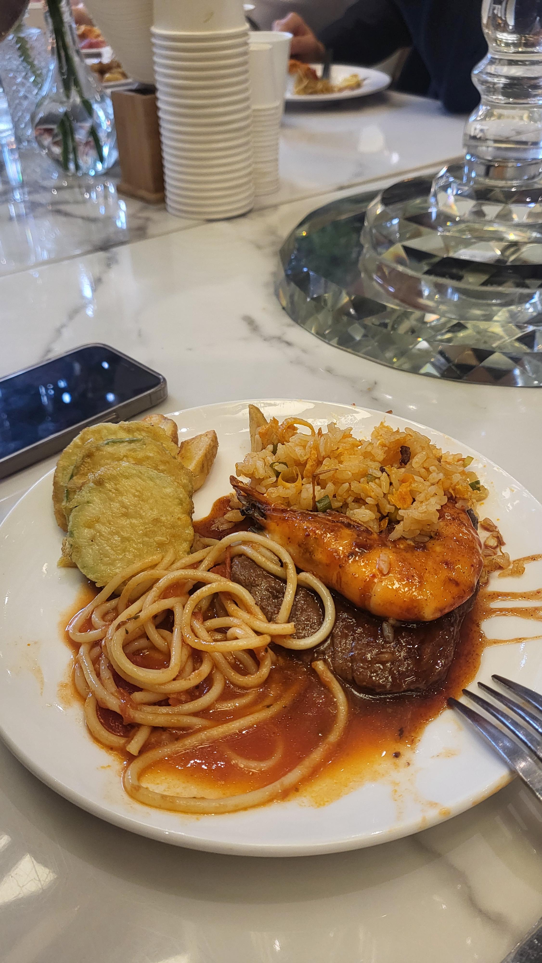 위에 사진은 남편 거 아래접시는 내 거... 남편은 뷔페 가면 볶음밥 꼭 먹어요🤣 보통 뷔페보다는 살짝 가짓수가 적지만 하나하나 다 맛있어서 대만족이었어요. 스테이크랑 연어회 백김치 육회 등... 맛있게 잘 먹었고, 다들 디저트도 너무 고급스럽고 맛있다며 야무지게 먹었습니다.