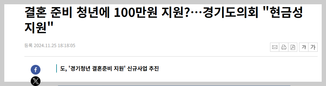 추가적으로 경기도 지원이 나오면 빠르게 포스팅해볼게요. 현재 경기도는 예비신혼부부들을 위한 신규사업 현금 지원금을 논의중이라고 합니다. <아래 사진 참고>