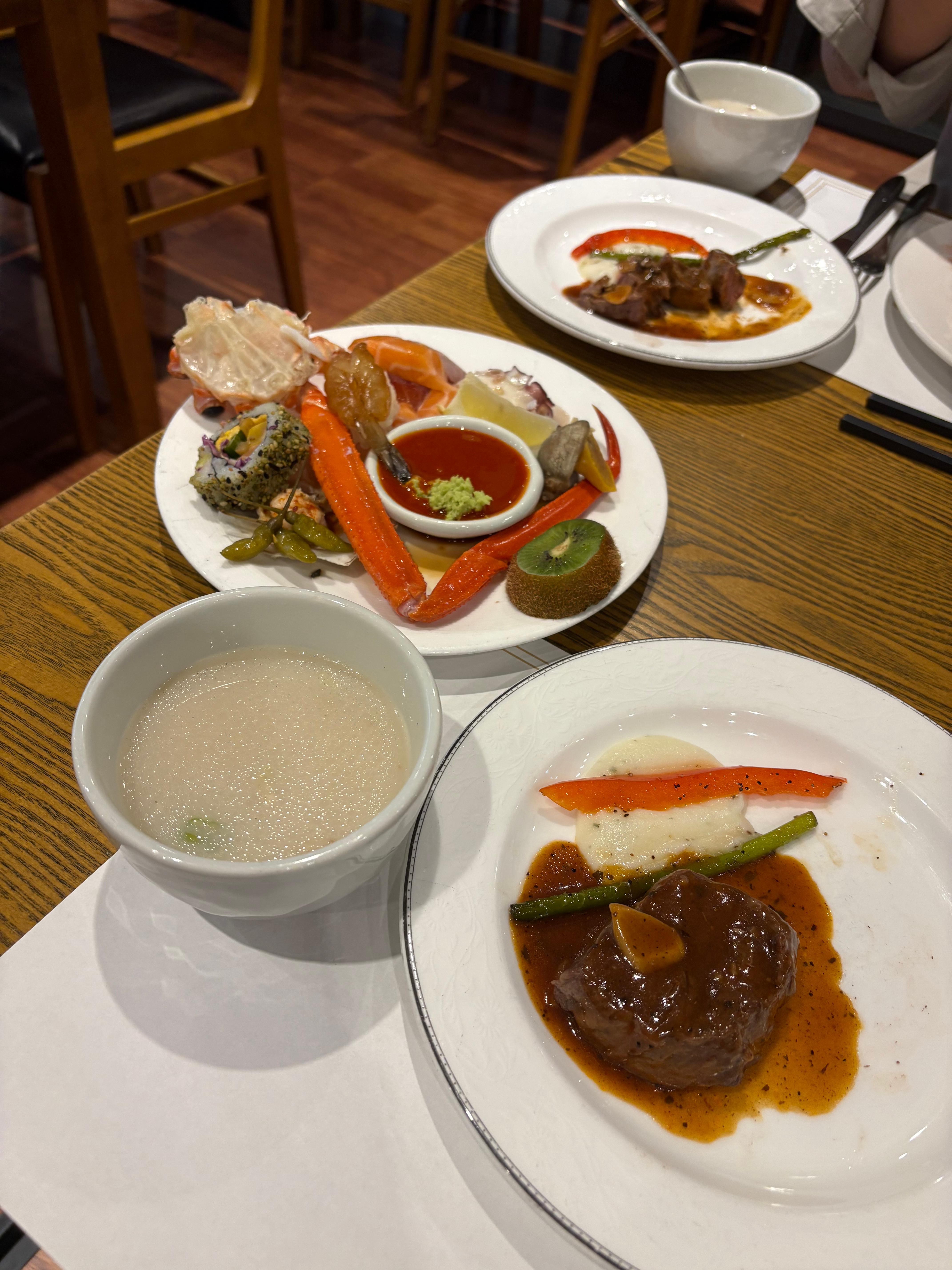 👉해산물 회는 생언어, 훈제연어, 참치 외 2종이 있었고, 초밥은 간장새우초밥 장어초밥이 눈에 띄었다. 가리비찜도 맛있었다. 홍게찜은 나는 비추천.
